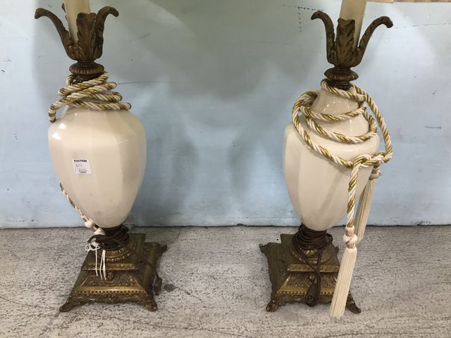 Pair of ceramic vase style lamps, metal ornate footed base, 38"h. Pair of ceramic vase style lamps, metal ornate footed base, 38"h.