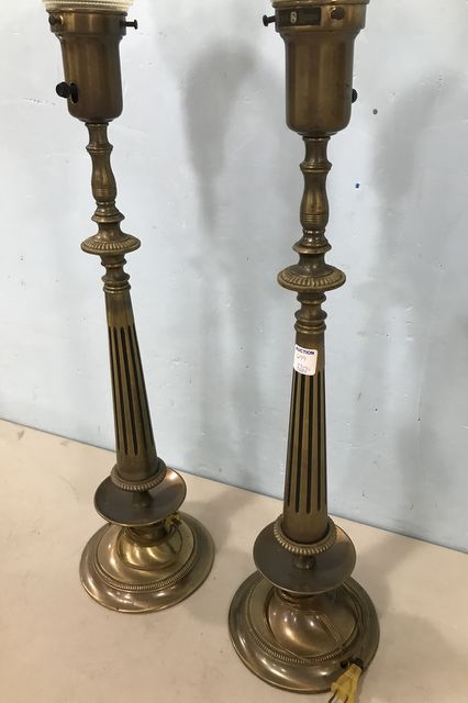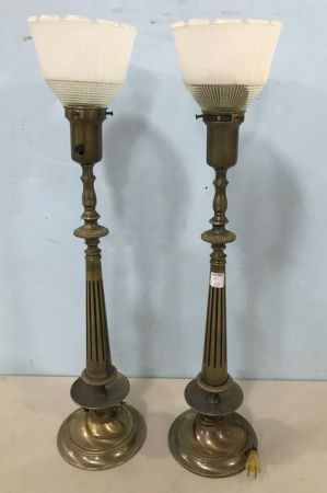 Rembrandt Lamp Corporation, Chicago, brass table lamps with frosted glass shades, one shade, 29"h. Rembrandt Lamp Corporation, Chicago, brass table lamps with frosted glass shades, one shade, 29"h.