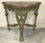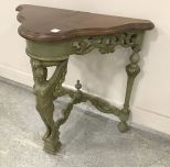 Vintage Demi lune wall stand, carved figural front leg, three leg with carved stretchers, carved border, top has chip, painted base, 24"h., 26"w., 18"d. Vintage Demi lune wall stand, carved figural front leg, three leg with carved stretchers, carved border, top has chip, painted base, 24"h., 26"w., 18"d.