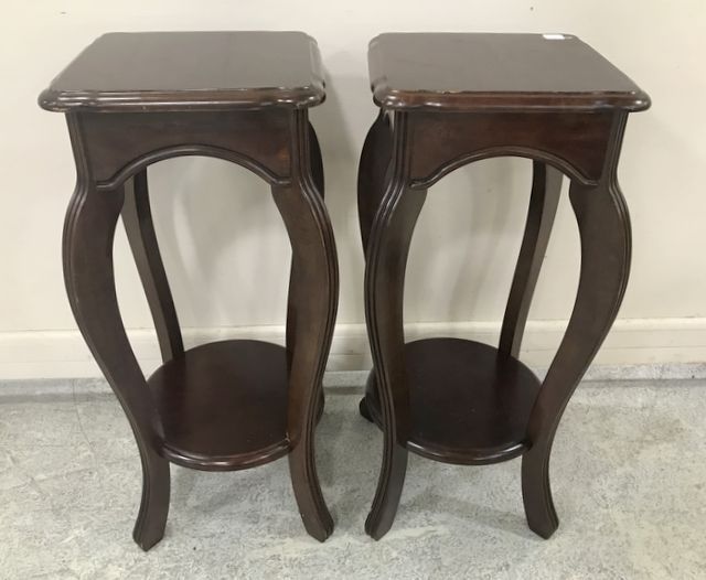 Pair of modern mahogany two tier fern stands, has some finish wear, bolt on legs, 28"h., 12"sq. Pair of modern mahogany two tier fern stands, has some finish wear, bolt on legs, 28"h., 12"sq.