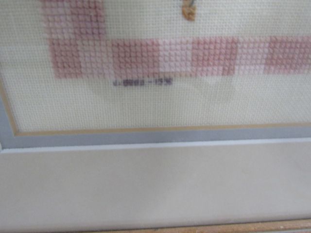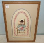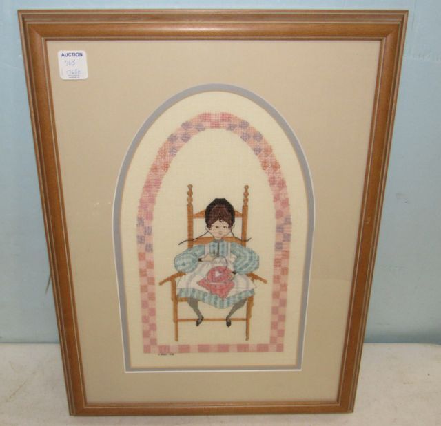 Artist is P. Buckley Moss, needlework creator is June Grigg, stitched by Jean BoBo, 1996, 18"h., 14"w. Artist is P. Buckley Moss, needlework creator is June Grigg, stitched by Jean BoBo, 1996, 18"h., 14"w.