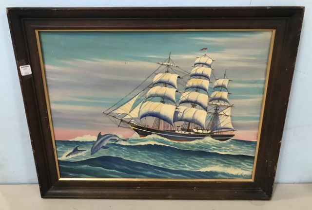 Oil painting on board of Ship and Dolphin, framed, signed, 22"h., 28"w. Oil painting on board of Ship and Dolphin, framed, signed, 22"h., 28"w.