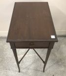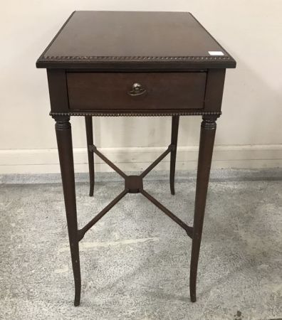 Mahogany one drawer stand, carved border, four leg with stretcher, has some wear, 26"h., 14"w., 26"d. Mahogany one drawer stand, carved border, four leg with stretcher, has some wear, 26"h., 14"w., 26"d.