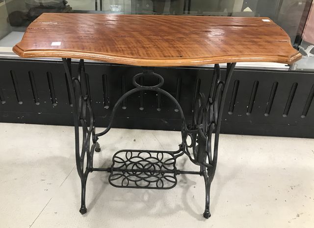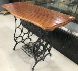 Vintage singer sewing machine base with cedar table top, 29"h., 35"w., 16"d. Vintage singer sewing machine base with cedar table top, 29"h., 35"w., 16"d.