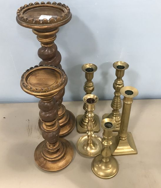 Jane Seymour 16"h resin candlestick, 5 brass colonial style candle holders. Jane Seymour 16"h resin candlestick, 5 brass colonial style candle holders.