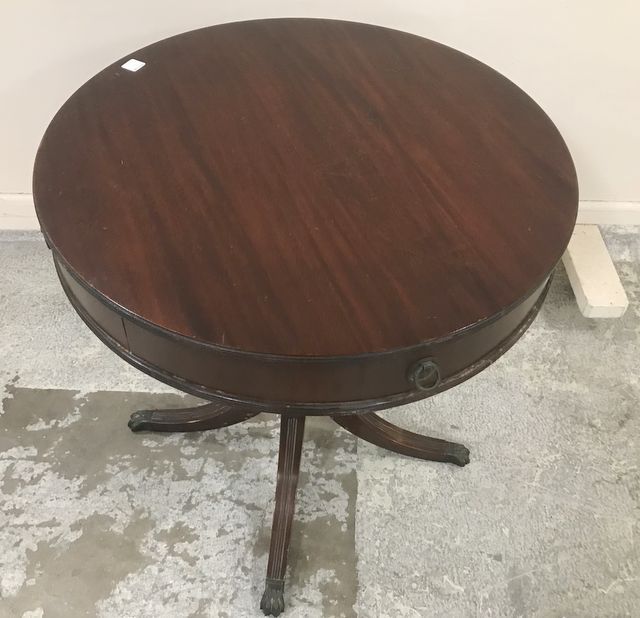 Duncan Phyfe style mahogany drum table, one drawer, 28"h., 26"dia. Duncan Phyfe style mahogany drum table, one drawer, 28"h., 26"dia.