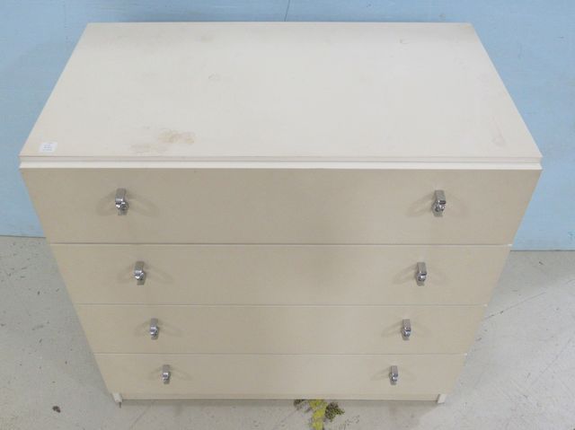 White four drawer chest with chrome pulls, has some stains on top, 30"h., 32"w., 18"d. White four drawer chest with chrome pulls, has some stains on top, 30"h., 32"w., 18"d.