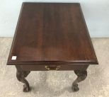 Modern mahogany finish single door side table, ball-n-claw feet, has wear and scratches, 22"h., 22"w., 27"d. Modern mahogany finish single door side table, ball-n-claw feet, has wear and scratches, 22"h., 22"w., 27"d.