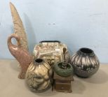 Resin carved task art, marble swan figurine, two hand made pottery vases, Coushatta mini grinder, European scene makeup box. Resin carved task art, marble swan figurine, two hand made pottery vases, Coushatta mini grinder, European scene makeup box.