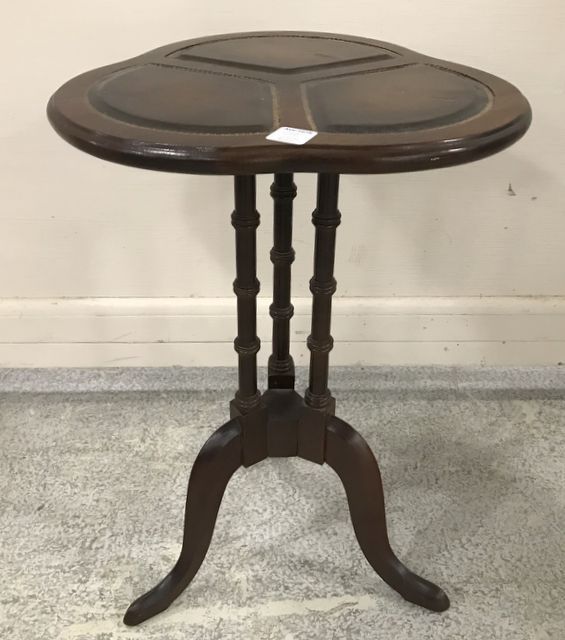 Vintage small pedestal stand with three leather sections on top, 20"h., 13"w. Vintage small pedestal stand with three leather sections on top, 20"h., 13"w.