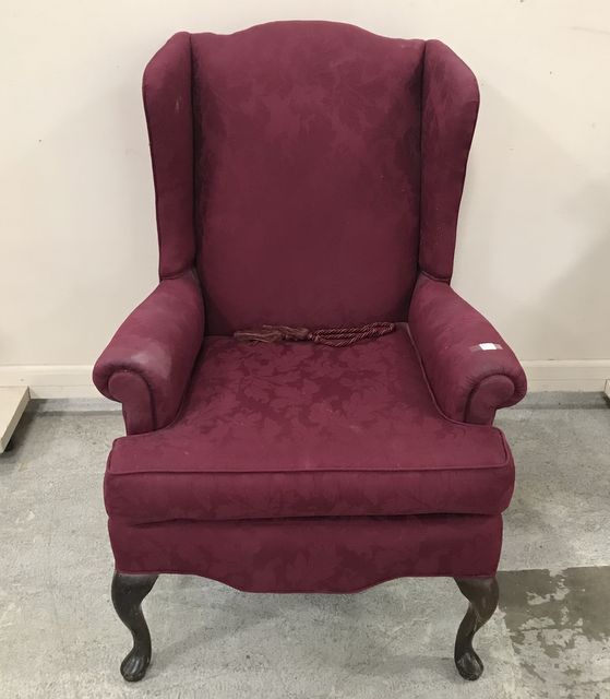 Red upholstered winged back arm chair, 42"h. Red upholstered winged back arm chair, 42"h.