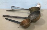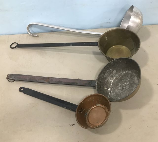 Three brass large ladles 22"h., and metal large ladle. Three brass large ladles 22"h., and metal large ladle.
