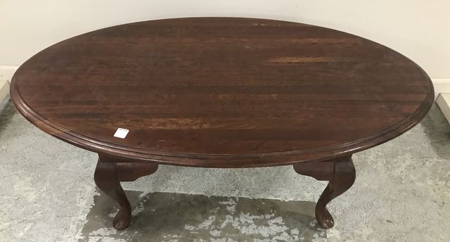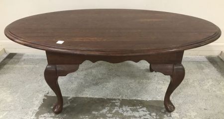 Cherry Queen Anne style coffee table, oval top, has some wear, 16"h., 43"L. Cherry Queen Anne style coffee table, oval top, has some wear, 16"h., 43"L.