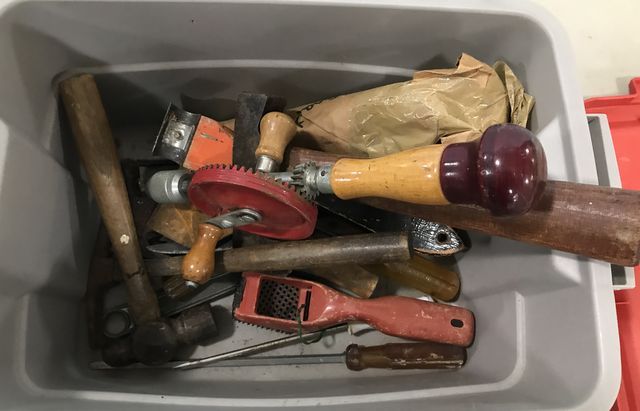 Hand drill, hammer, hatchet, flat head screw driver, wrenches, scrapper. Hand drill, hammer, hatchet, flat head screw driver, wrenches, scrapper.
