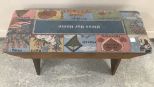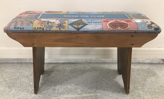 Primitive style bench with Bless Our Home upholstered Seat, 19"h., 30"w. Primitive style bench with Bless Our Home upholstered Seat, 19"h., 30"w.
