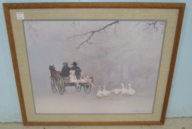 Colonial family in carriage with ducks, 21"h., 25"w. Colonial family in carriage with ducks, 21"h., 25"w.