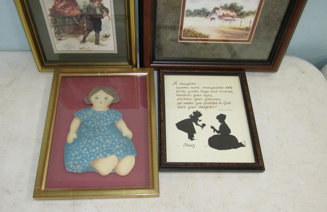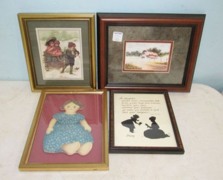 Print of Barn in Field 9"h., 11"w., Children in snow, shadow box framed doll, a daughter silhouette print. Print of Barn in Field 9"h., 11"w., Children in snow, shadow box framed doll, a daughter silhouette print.