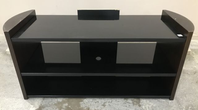 Modern two tier glass tv stand, has wear, 21"h., 49"w. Modern two tier glass tv stand, has wear, 21"h., 49"w.