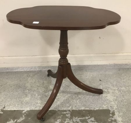 Modern Bombay pedestal accent table, one wheel, has wear, 23"h., 24"w. Modern Bombay pedestal accent table, one wheel, has wear, 23"h., 24"w.