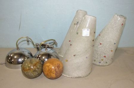 Three frosted art glass decor pieces, two stainless light fixtures, two marble decor balls. Three frosted art glass decor pieces, two stainless light fixtures, two marble decor balls.