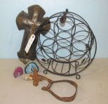 Metal wine table rack 14"h., Jesus on the cross wall piece, polished stones, antique horse stirrup, iron fence finial, Metal wine table rack 14"h., Jesus on the cross wall piece, polished stones, antique horse stirrup, iron fence finial,