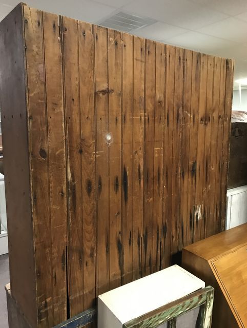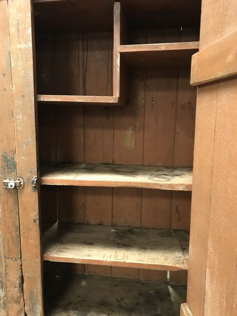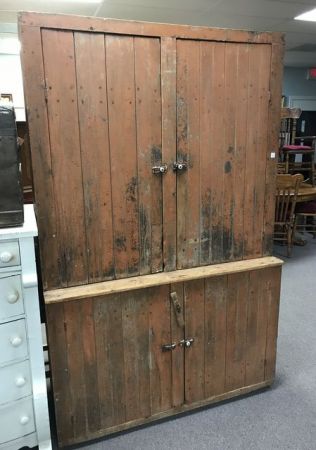 Primitive Painted Two Piece Cabinet, double door, with shelves, base has double door, latches with small white knobs, distressed, 79"h., 50"w., 17"d Primitive Painted Two Piece Cabinet, double door, with shelves, base has double door, latches with small white knobs, distressed, 79"h., 50"w., 17"d