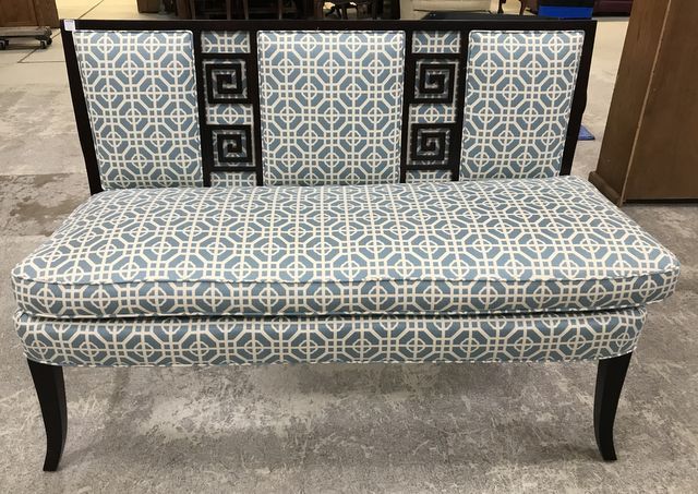 Lee Jofa Decorative Settee, black painted frame, blue and white upholstered seat, 38"h., 54"w. Lee Jofa Decorative Settee, black painted frame, blue and white upholstered seat, 38"h., 54"w.