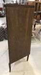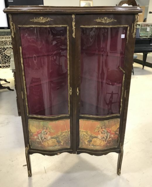 French Style Curio Display Corner Cabinet, double bow door with bow glass, needle point artwork panels, needs a good of work, the brass ormolu has broken off (have most pieces), chipping in veneer, three shelves, has key, 59"h., 38"w., 19"d. French Style Curio Display Corner Cabinet, double bow door with bow glass, needle point artwork panels, needs a good of work, the brass ormolu has broken off (have most pieces), chipping in veneer, three shelves, has key, 59"h., 38"w., 19"d.