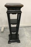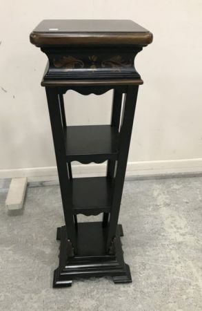 French Design black pedestal with two tier display shelves, footed base, floral painted trim work, modern piece, 42"h., 14"w. Some scuffs on top where vase was. French Design black pedestal with two tier display shelves, footed base, floral painted trim work, modern piece, 42"h., 14"w. Some scuffs on top where vase was.
