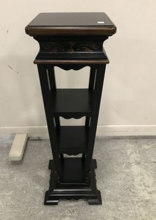French Design black pedestal with two tier display shelves, footed base, floral painted trim work, modern piece, 42"h., 14"w. Some scuffs on top where vase was. French Design black pedestal with two tier display shelves, footed base, floral painted trim work, modern piece, 42"h., 14"w. Some scuffs on top where vase was.