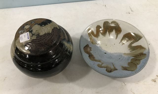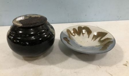 Two signed hand made pottery, hand painted bowl 9"dia., glazed covered vase 6"h. Two signed hand made pottery, hand painted bowl 9"dia., glazed covered vase 6"h.