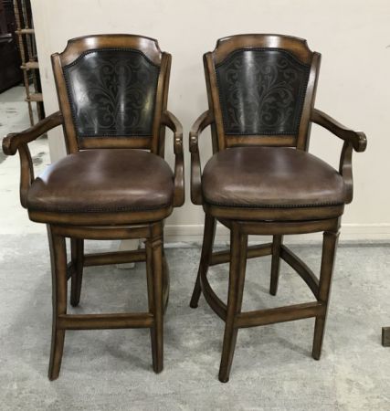 Pair of modern arm barstools, leather seats, swivel, designed metal back rest, 47"h., 29" from seat to floor. Pair of modern arm barstools, leather seats, swivel, designed metal back rest, 47"h., 29" from seat to floor.