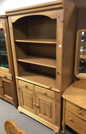 Broyhill pine bookcase, two display shlves, two drawers, double door storage bottom, lighted, good condition, 74"h., 36"w., 17"d. Broyhill pine bookcase, two display shlves, two drawers, double door storage bottom, lighted, good condition, 74"h., 36"w., 17"d.