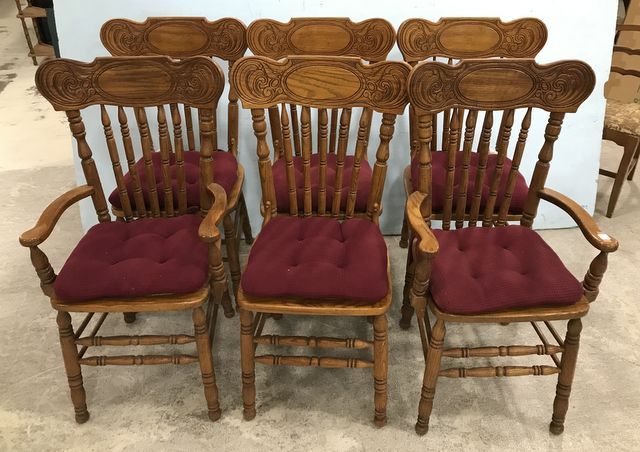 Six Pressed Back Oak Dining Chairs, two arms, four sides, sides have the cane bottom, arms are missing cane bottom. Six Pressed Back Oak Dining Chairs, two arms, four sides, sides have the cane bottom, arms are missing cane bottom.
