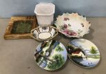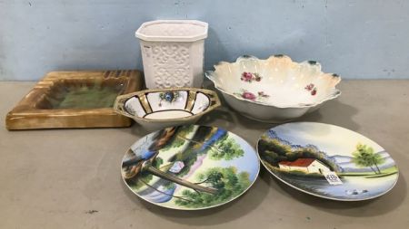 Hand painted roses bowl, two collector plates, Noritake hand painted dish, White ceramic compote, hand made pottery ashtray. Hand painted roses bowl, two collector plates, Noritake hand painted dish, White ceramic compote, hand made pottery ashtray.