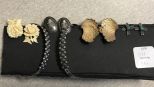 Vintage earrings, pair brass marked Coro, unmarked faux carved roses, pair markeed sterling made in Siam, Pair of cross arrows with green stones, marked sterling. Vintage earrings, pair brass marked Coro, unmarked faux carved roses, pair markeed sterling made in Siam, Pair of cross arrows with green stones, marked sterling.
