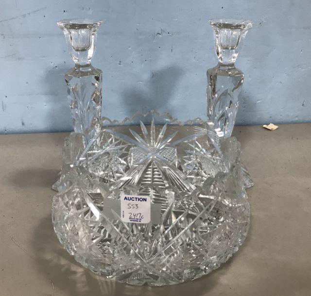 Cut Glass Bowl 5"h., 7"dia., and Pressed Glass Candle Holders 9"h Cut Glass Bowl 5"h., 7"dia., and Pressed Glass Candle Holders 9"h