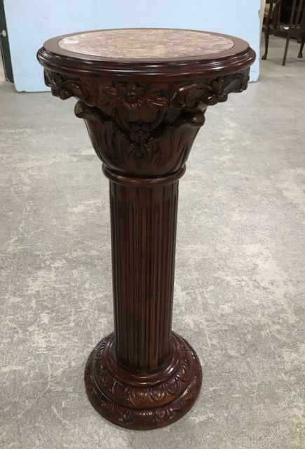 Antique Reproduction Carved Cherry Pedestal Stand, round top with marble top, 36"h., 16"dia. Antique Reproduction Carved Cherry Pedestal Stand, round top with marble top, 36"h., 16"dia.