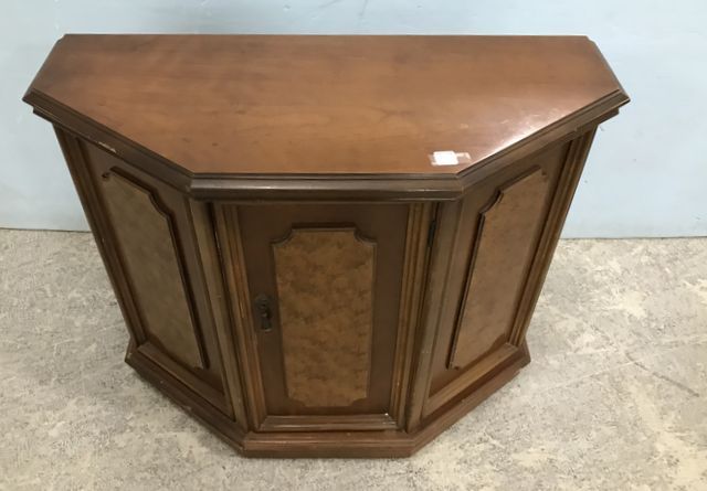 Modern Cherry Demilune Chest, single door, one shelf, burl panel designs, has some wear on base, 29"h., 34"w., 14"d. Modern Cherry Demilune Chest, single door, one shelf, burl panel designs, has some wear on base, 29"h., 34"w., 14"d.