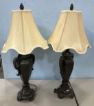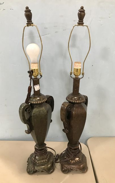 Pair of Rustic Resin Urn Style Lamps, one has some base chips, 31"h. Pair of Rustic Resin Urn Style Lamps, one has some base chips, 31"h.