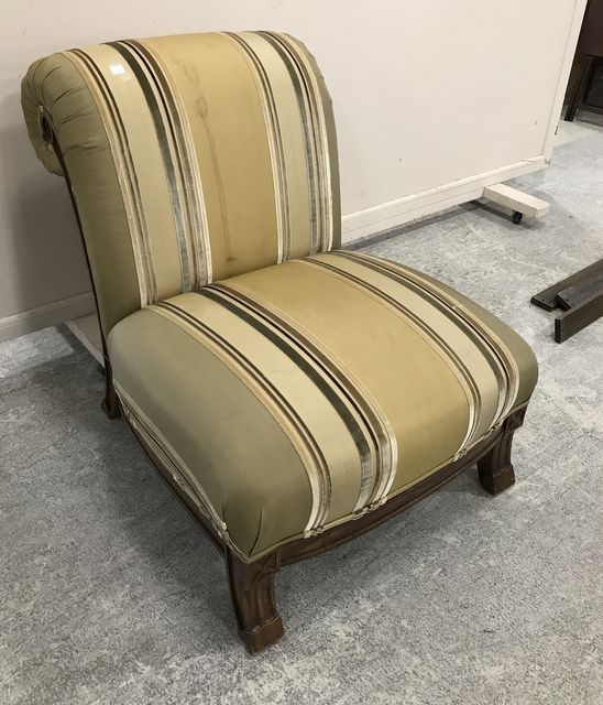 French Provincial Style Arm less Club Chair, scroll back, striped fabric, does have stains, 32"h. French Provincial Style Arm less Club Chair, scroll back, striped fabric, does have stains, 32"h.