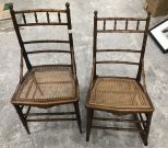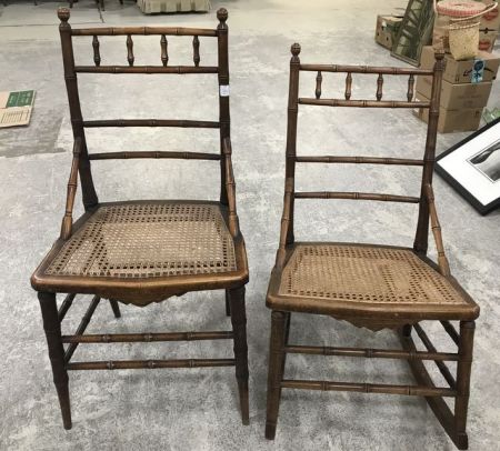 Two Antique Cane Bottom Chair and Rocker, wood bamboo style frame, cane bottom, good condition, 34"h. Two Antique Cane Bottom Chair and Rocker, wood bamboo style frame, cane bottom, good condition, 34"h.