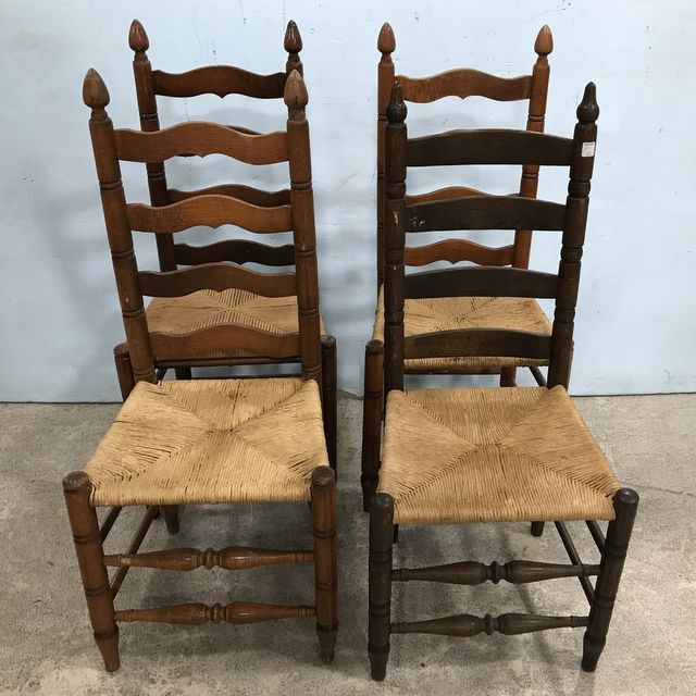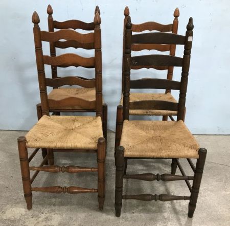Four Ladder Back Woven Chairs, two darker finish, two light finish, woven seats, colonial style, 42"h. Four Ladder Back Woven Chairs, two darker finish, two light finish, woven seats, colonial style, 42"h.