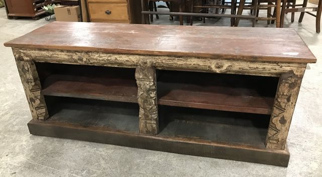 Indo Rustic Style Tv Stand, open front with single shelve, distressed painted, 20"h., 51"w., 16"d. Indo Rustic Style Tv Stand, open front with single shelve, distressed painted, 20"h., 51"w., 16"d.