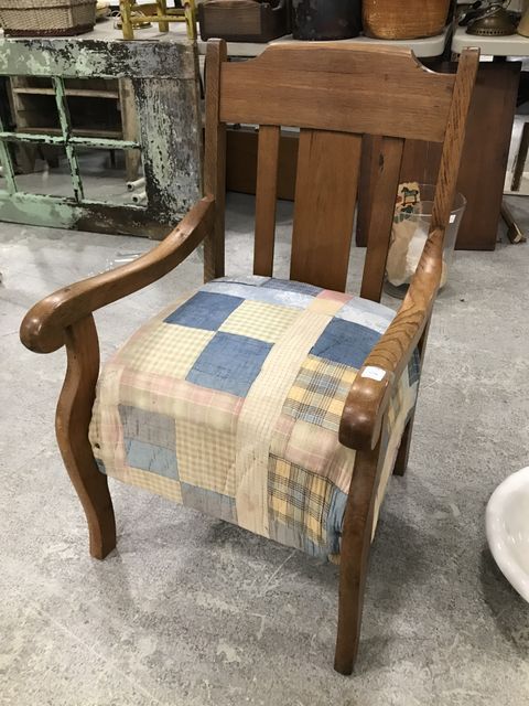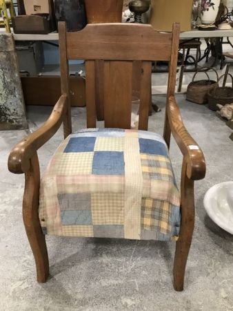 Vintage Oak Arm Chair, quilt seat, good condition, 34"h. Vintage Oak Arm Chair, quilt seat, good condition, 34"h.