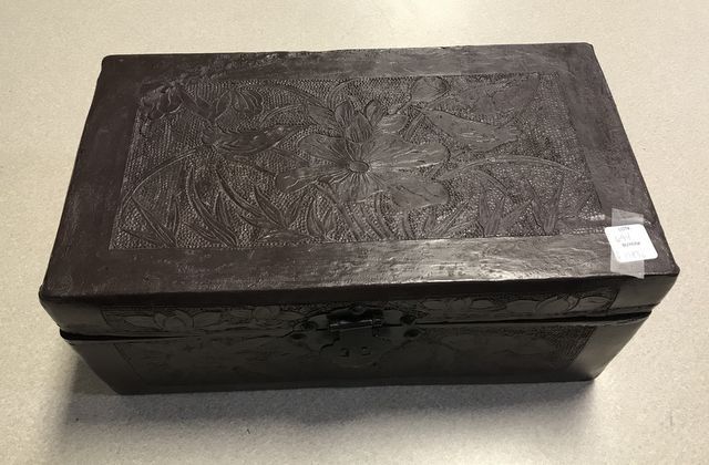 Old Hand Leather storage box with inner tray, handles, good condition, 6"h., 15"w., 8"d. Old Hand Leather storage box with inner tray, handles, good condition, 6"h., 15"w., 8"d.