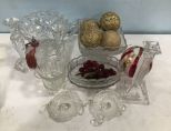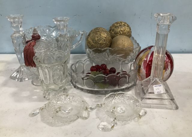Clear glass candle holders, handled compote, center piece bowl, liberty glass bowl, vase, hand painted bowl, covered jar, decorative balls. Clear glass candle holders, handled compote, center piece bowl, liberty glass bowl, vase, hand painted bowl, covered jar, decorative balls.