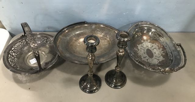 Etched silver plate handle baskets, and two silver plate candle holders. Etched silver plate handle baskets, and two silver plate candle holders.