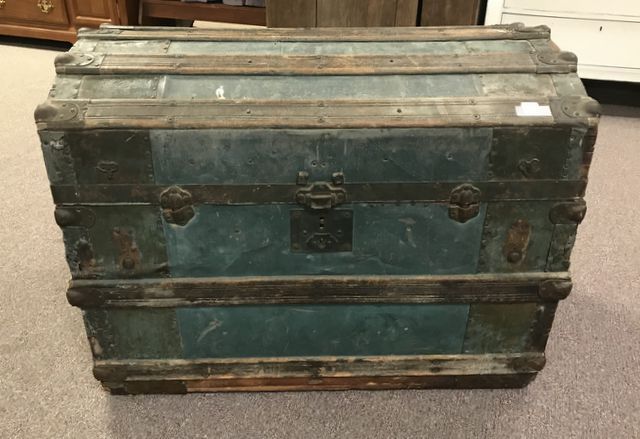 Antique Dome Top Streamer Trunk, inner tray, no handles, wood and tin, 24"h., 32"w. Antique Dome Top Streamer Trunk, inner tray, no handles, wood and tin, 24"h., 32"w.