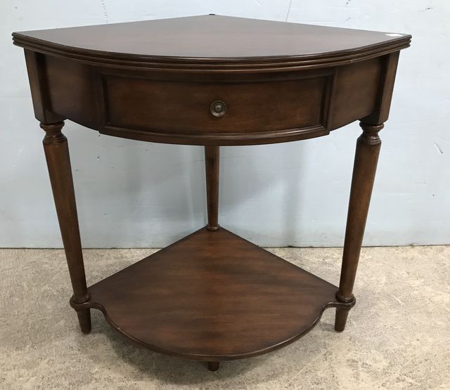 Corner Cherry Console Table, modern, single drawer, two tier, 30"h., 30"w., 24"d. Corner Cherry Console Table, modern, single drawer, two tier, 30"h., 30"w., 24"d.